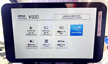 7カ国の言語変換、お客様が支払い方法をお選び頂けるタブレットです。QRコードやGOアプリを使って読み込み決済することも可能です。